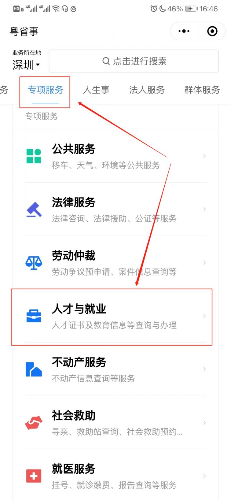 (2)打开“粤省事”微信小程序,经实名认证后,点击人才与就业专项服务栏目,进入毕业生服务板块,按要求进行网上报到。