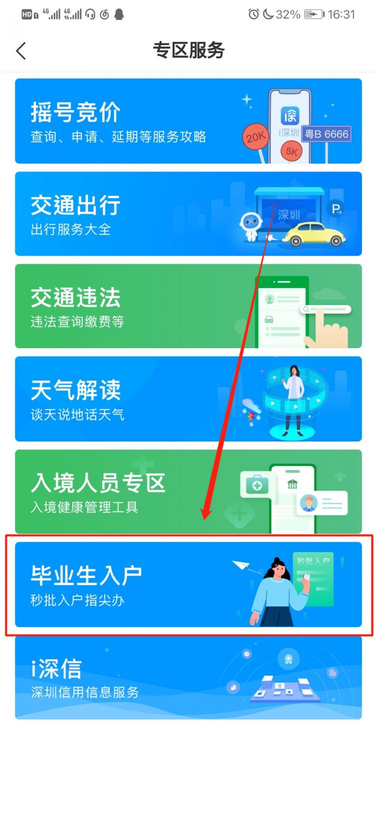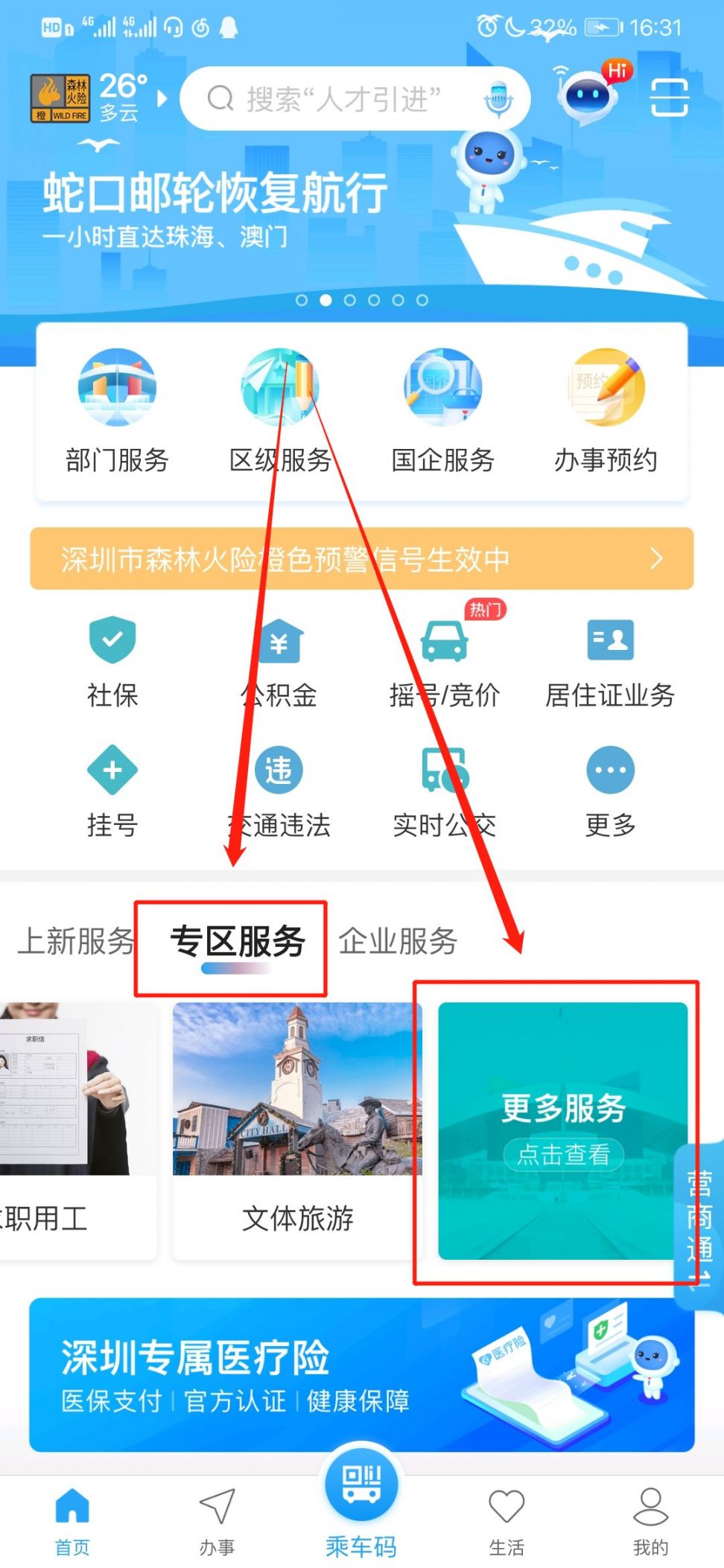 2.进入app后,点击主页中的“专区服务”并点击“更多服务”,在服务列表中选择“毕业生入户”;