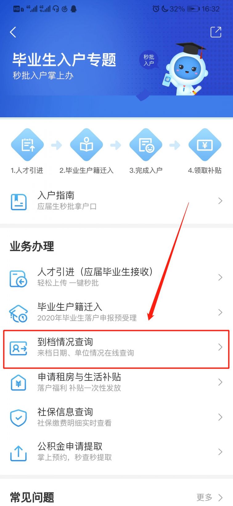 3.进入毕业生专题后,点击“到档情况查询”,即可进入人才档案查询系统;