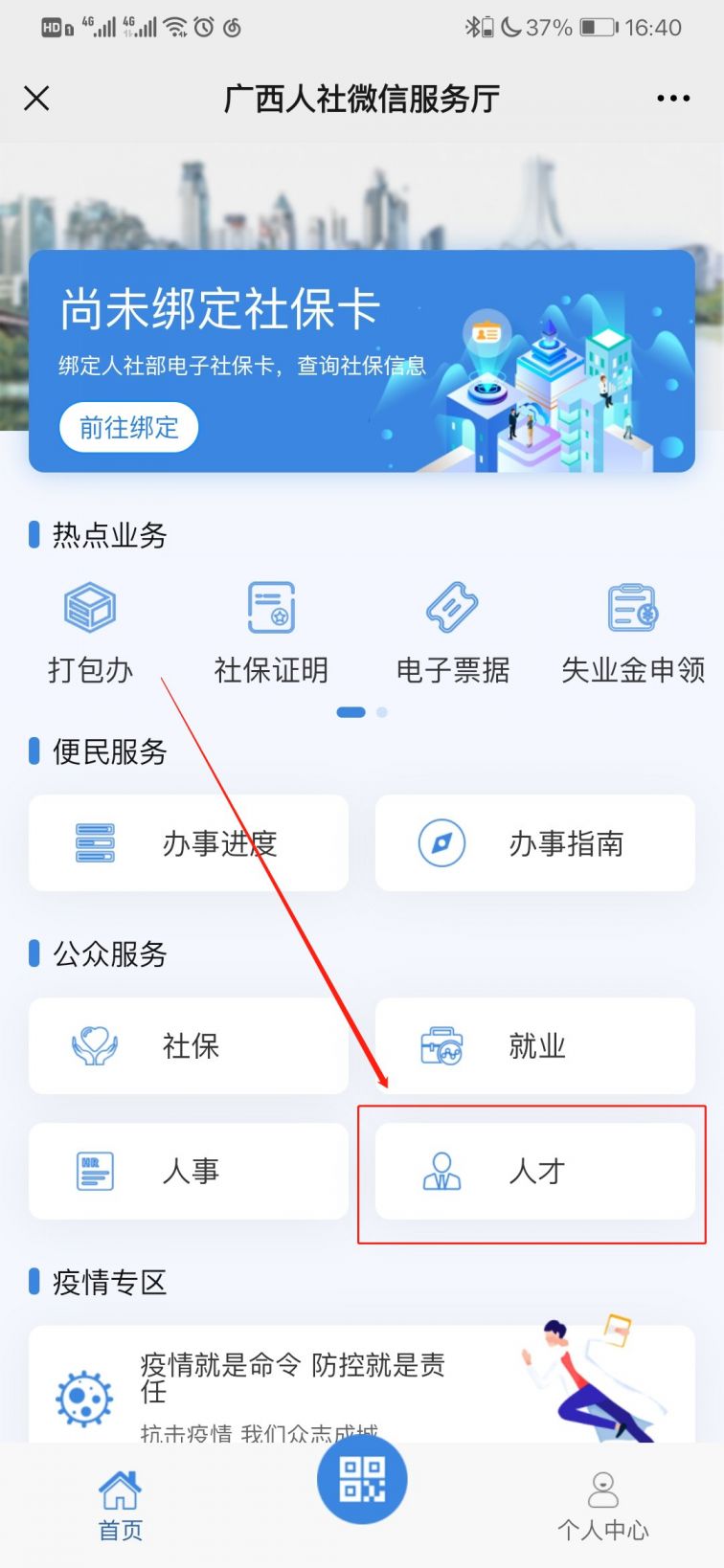 2.进入公众号后,点击菜单栏中的“服务大厅”,选择“人才”,并点击“(区直)人事档案存放地查询”即可进入广西毕业生档案查询页面。