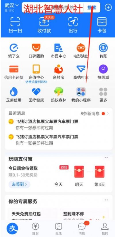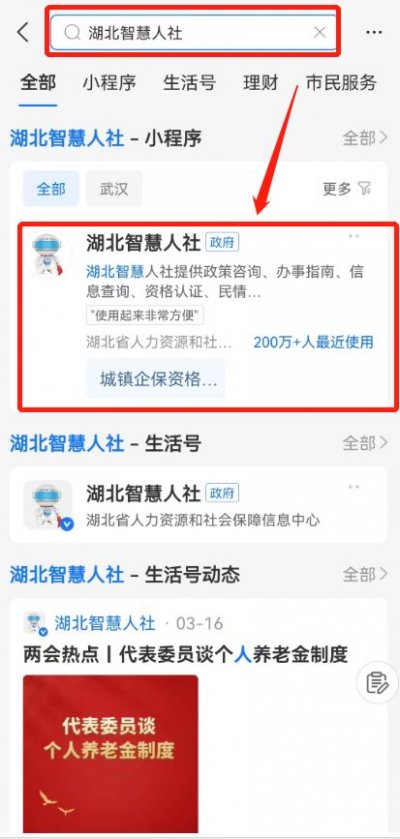 1、进入“支付宝”app;在搜索栏搜索“湖北智慧人社”