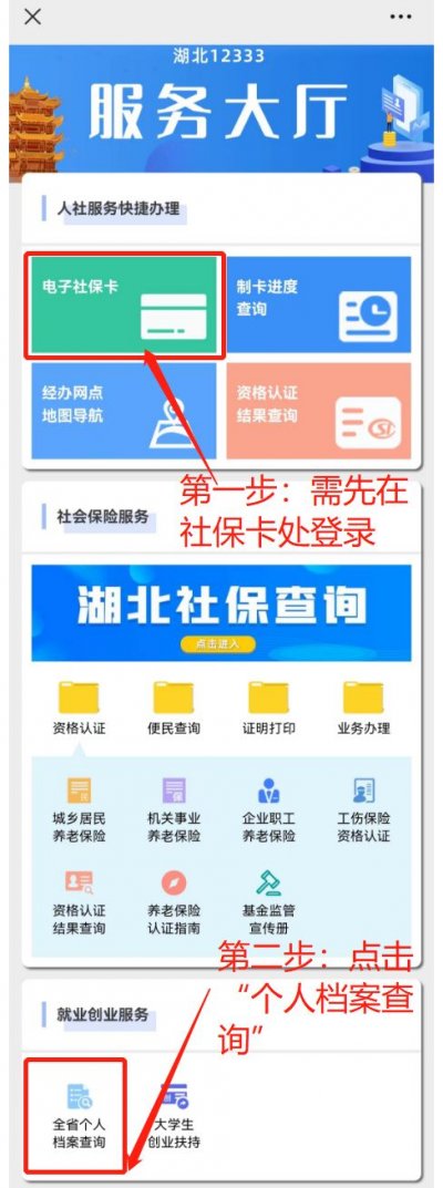 打开“湖北12333”微信公众号中“微服务”,选择“全省个人档案查询”完成查询。(备注:需查询到电子社保卡的信息才能进行下一步的档案查询。)
