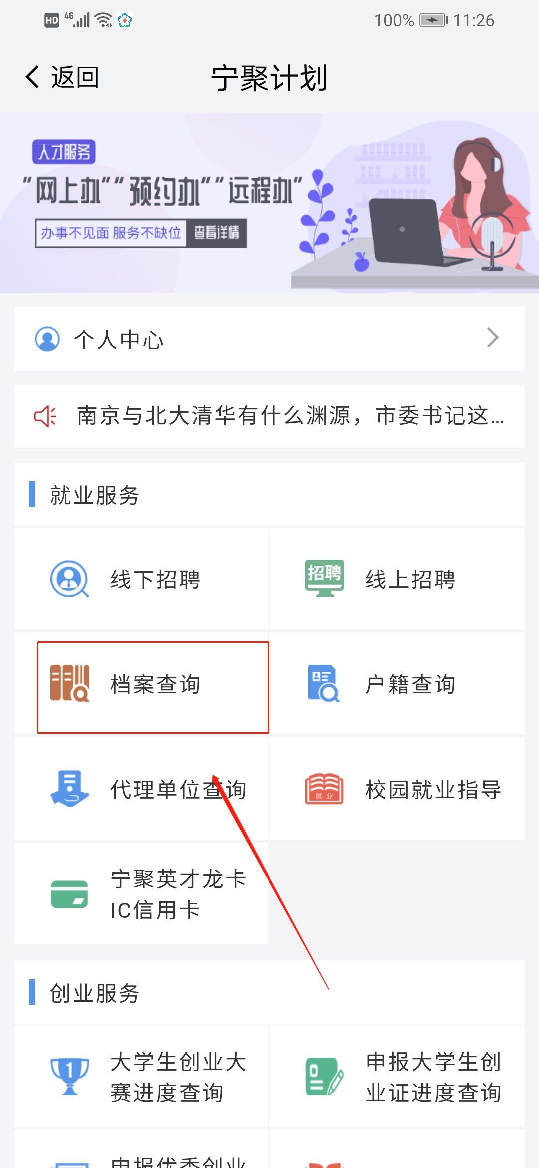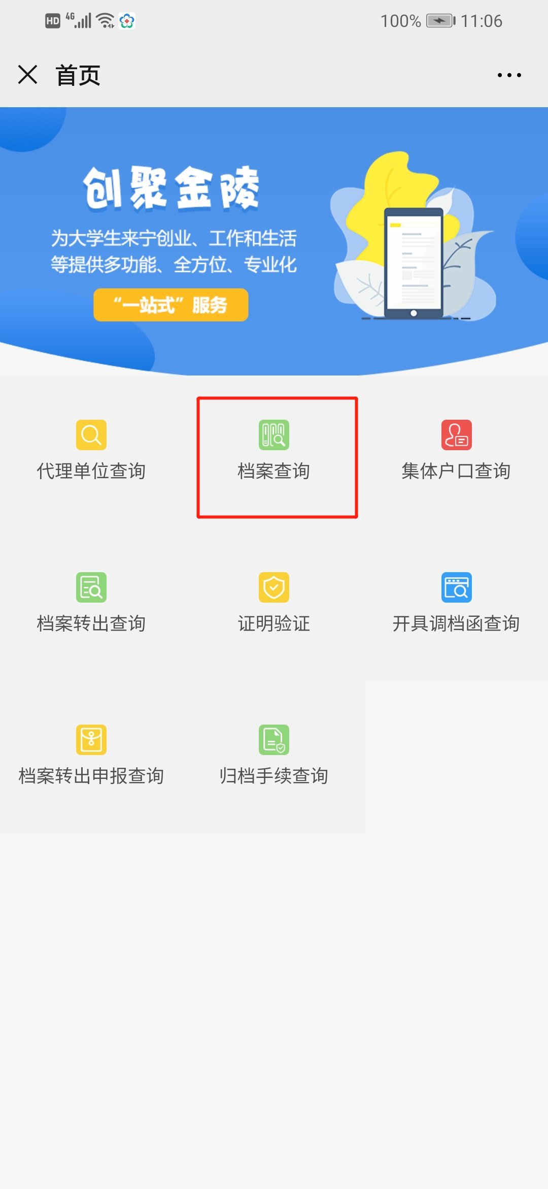 4、手机下载“我的南京”app,安装后登录,搜索档案,点击“档案服务”进入后,点击“档案查询”即可查询档案。