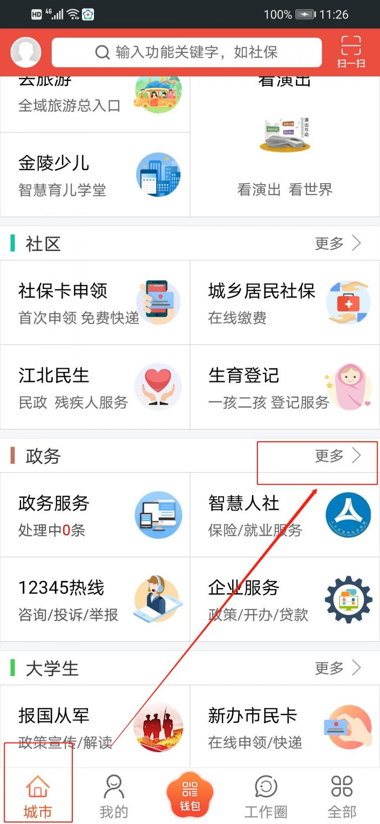 2、在城市页面,找到“政务”,然后点击“更多”;