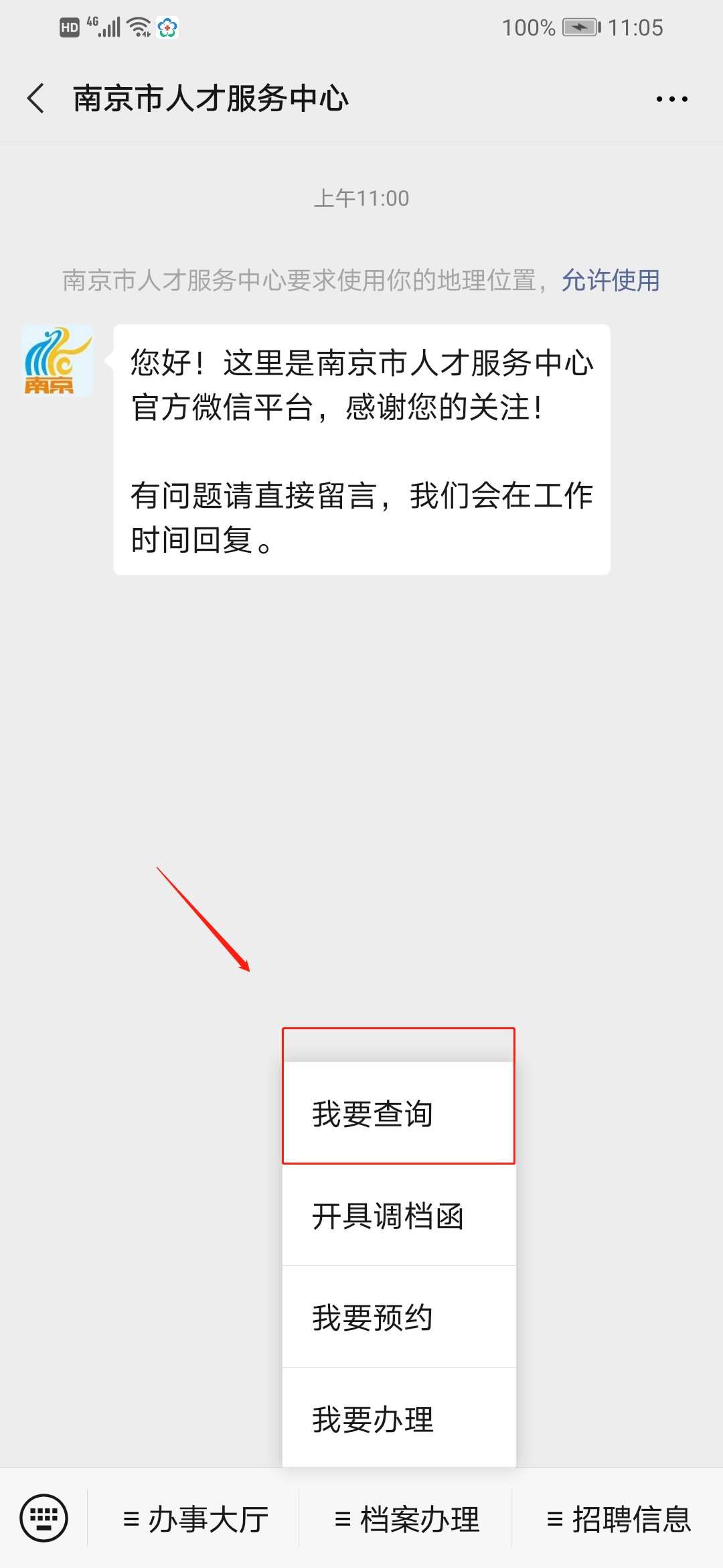 2、手机关注“南京市人才服务中心”微信公众号,点击菜单栏“办事大厅”,登录后点击“我要查询”栏目内查询。