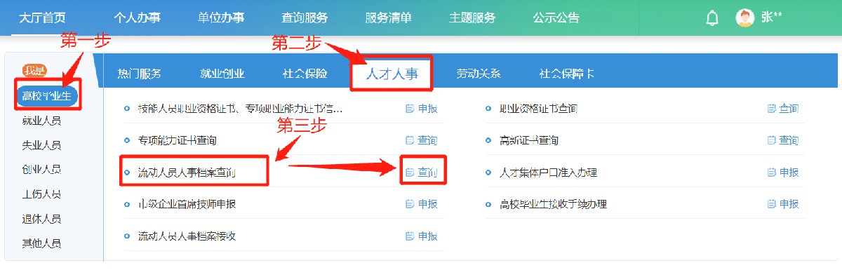 进入江苏人社网大厅,在首页依次选择“我是高校毕业生-人才人事-流动人员人事档案查询”,点击查询即可进入查询页面: