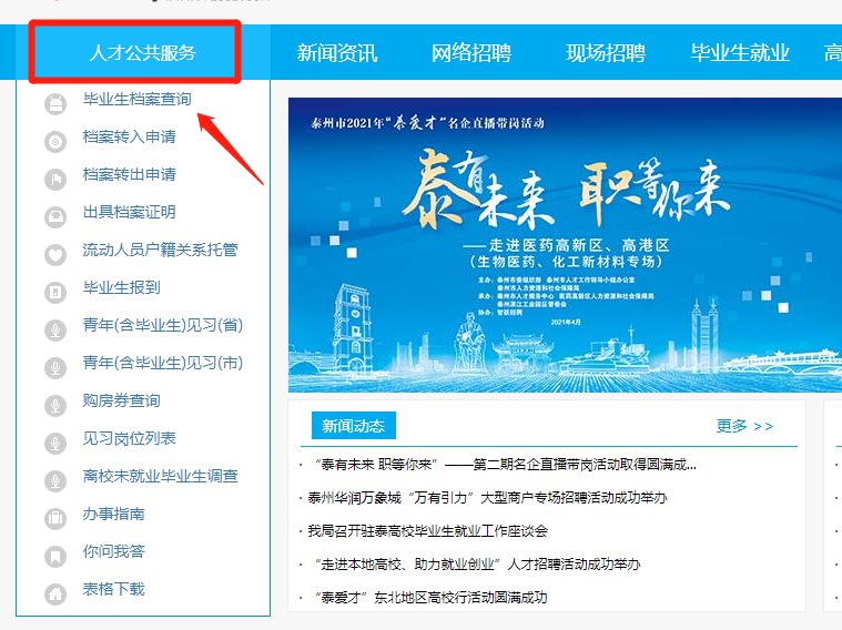 进入泰州人才网首页,在“人才公共服务”专栏下,选择“毕业生档案查询”即可进入档案查询系统:
