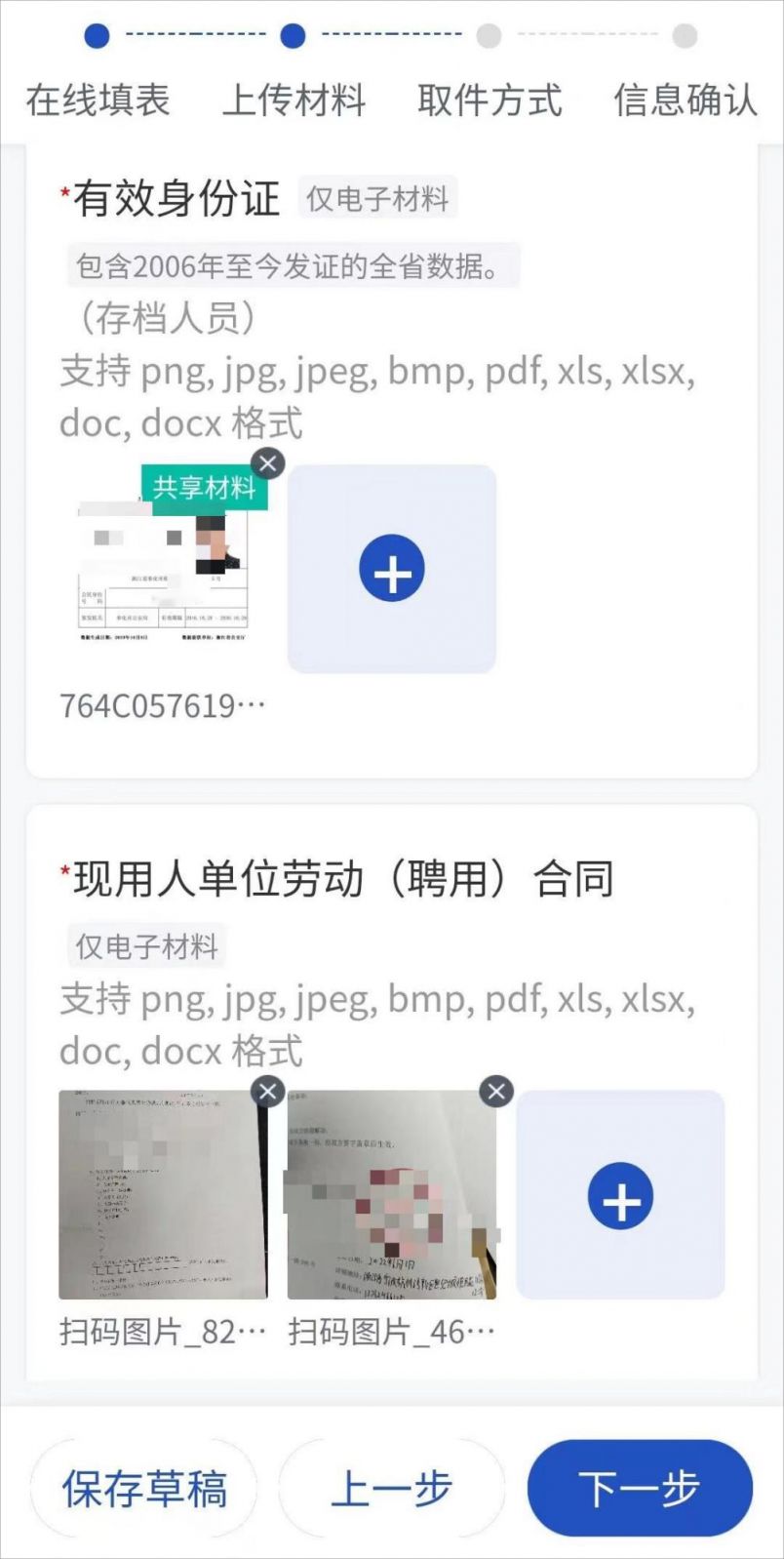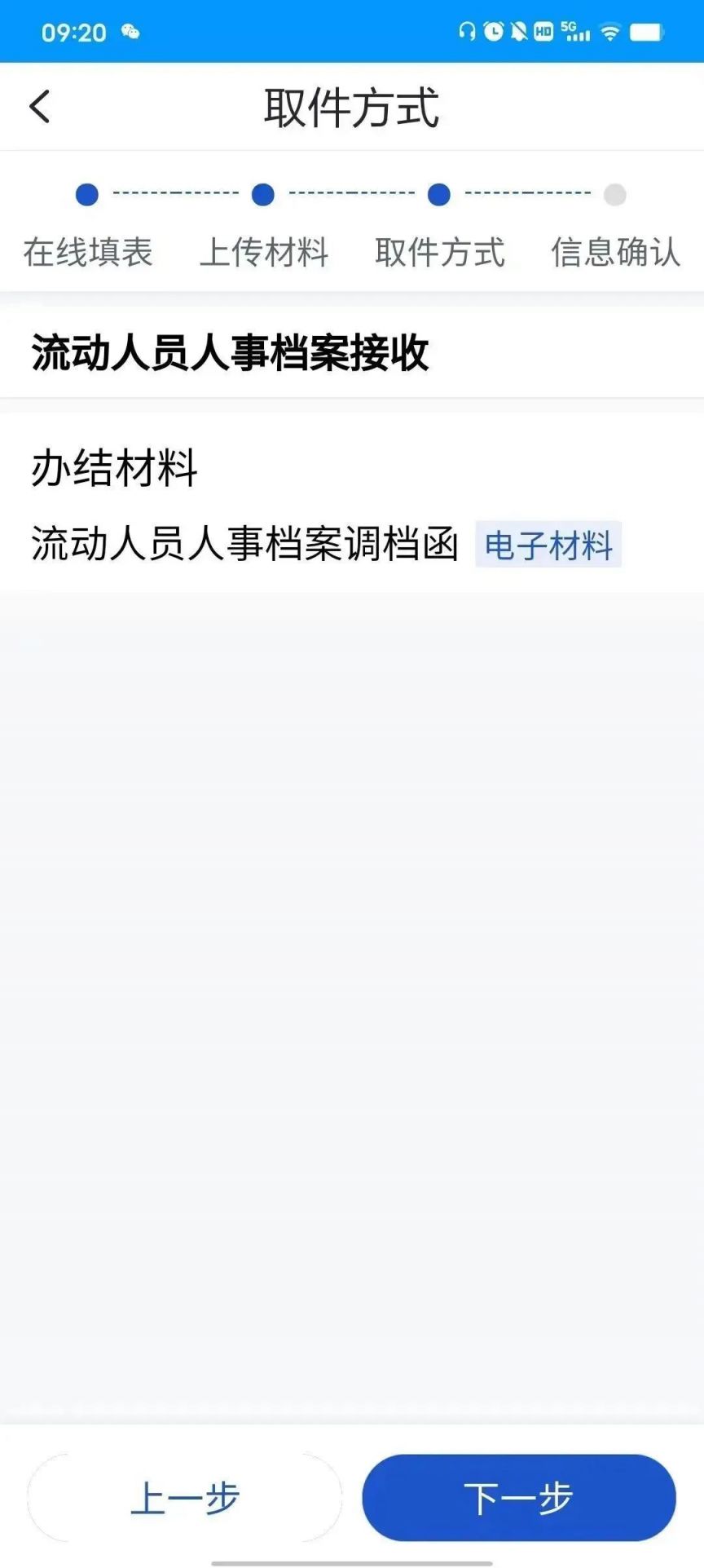 点击“下一步”上传材料,完成后点击下一步,取件方式选择自行下载,点击下一步。