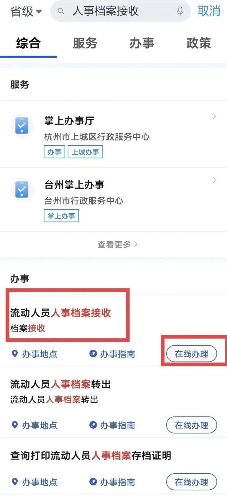 点开“浙里办”APP,注册登录个人账户,搜索“人事档案接收”,点击“流动人员人事档案接收”。
