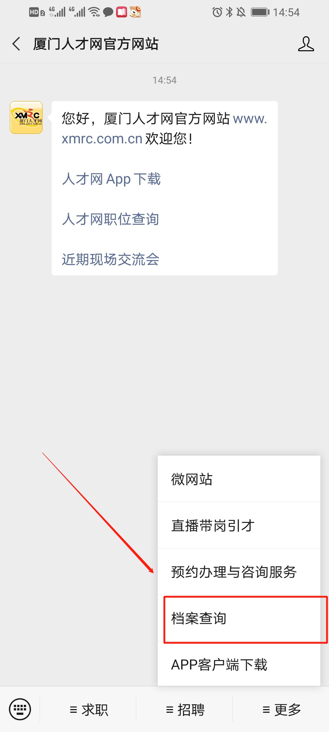微信搜索“厦门人才网官方网站”公众号,然后点击进入并关注,然后点击进入,点击页面下方“更多”-“档案查询”;然后进入输入姓名和身份证号码即可查询;