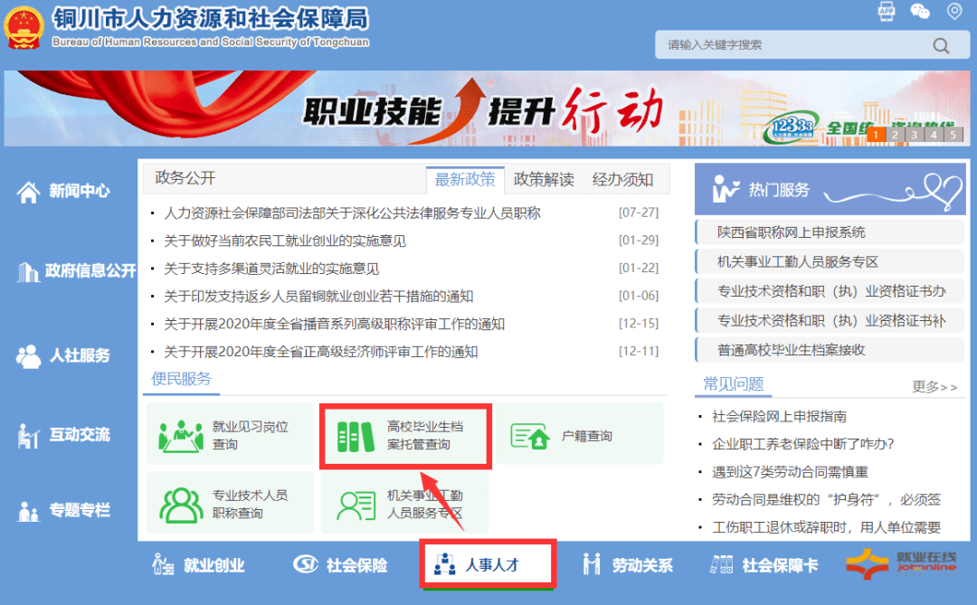 途径2:登录网址:http://www.tongchuanhrss.gov.cn/,点击“人事人才”模块进入档案查询模块。