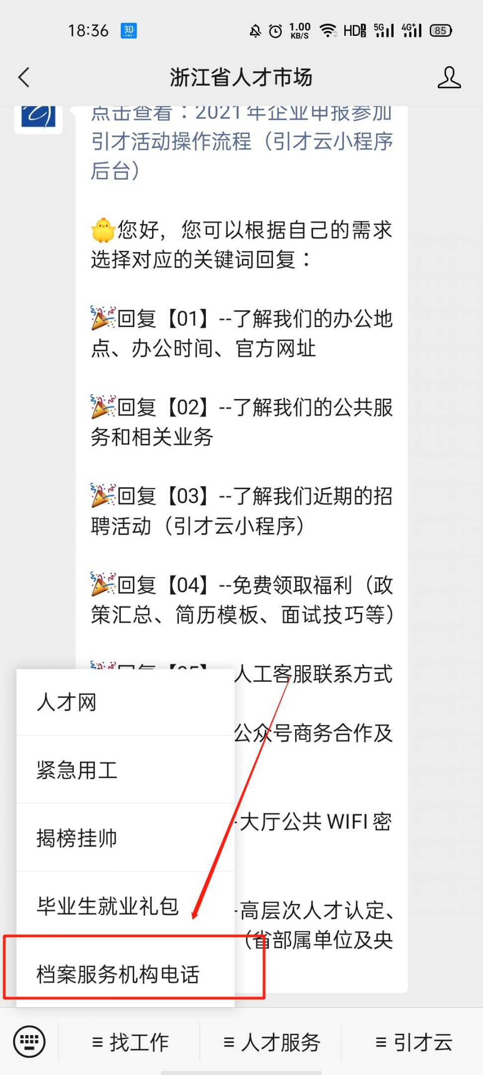 也可点击左下角菜单栏的“找工作”—“档案服务机构电话”获取杭州各个区档案服务机构电话,并打电话进行咨询。