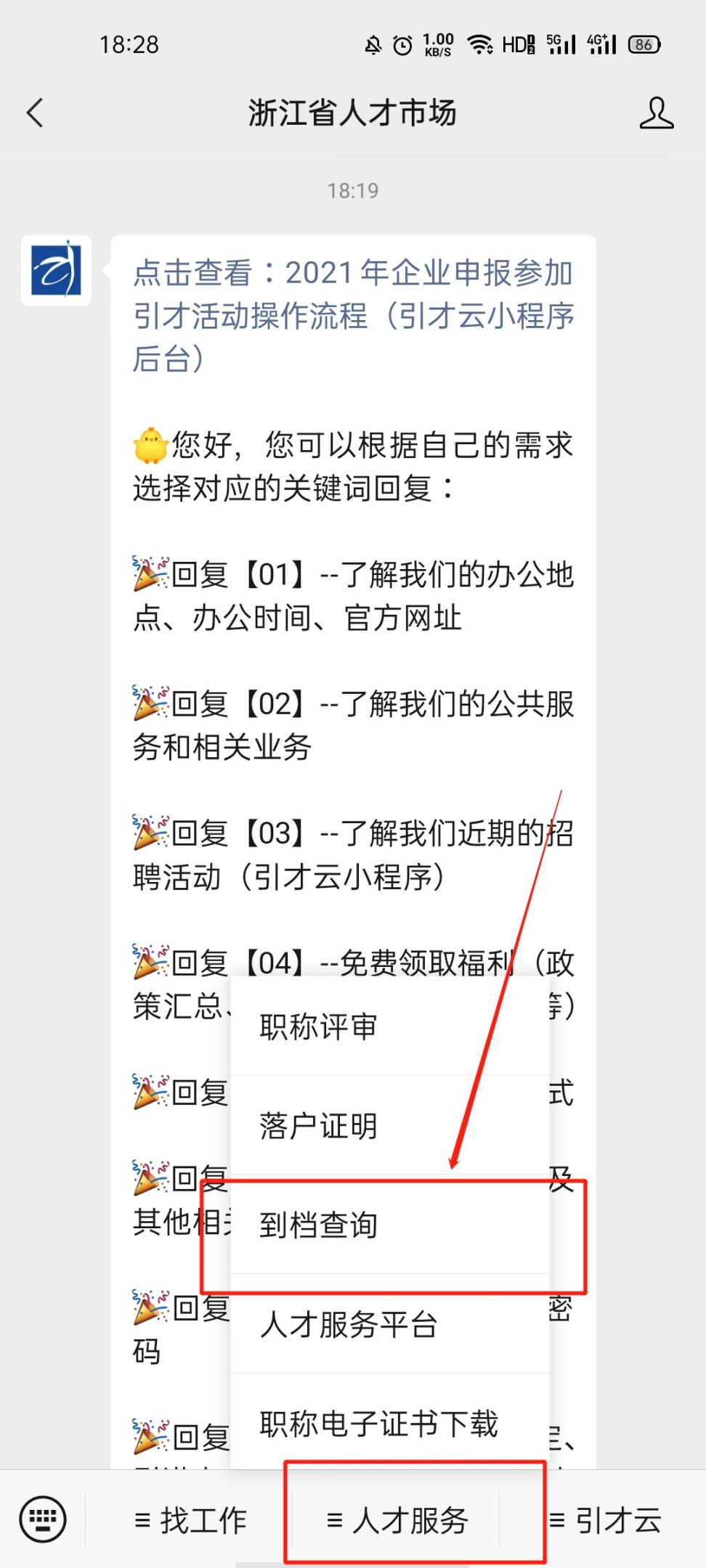 2.关注后点击菜单栏的“人才服务”—“到档查询”;