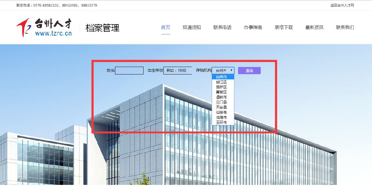 2、输入姓名、出生年份、存档机构,即可查询台州市内人事档案所在地。