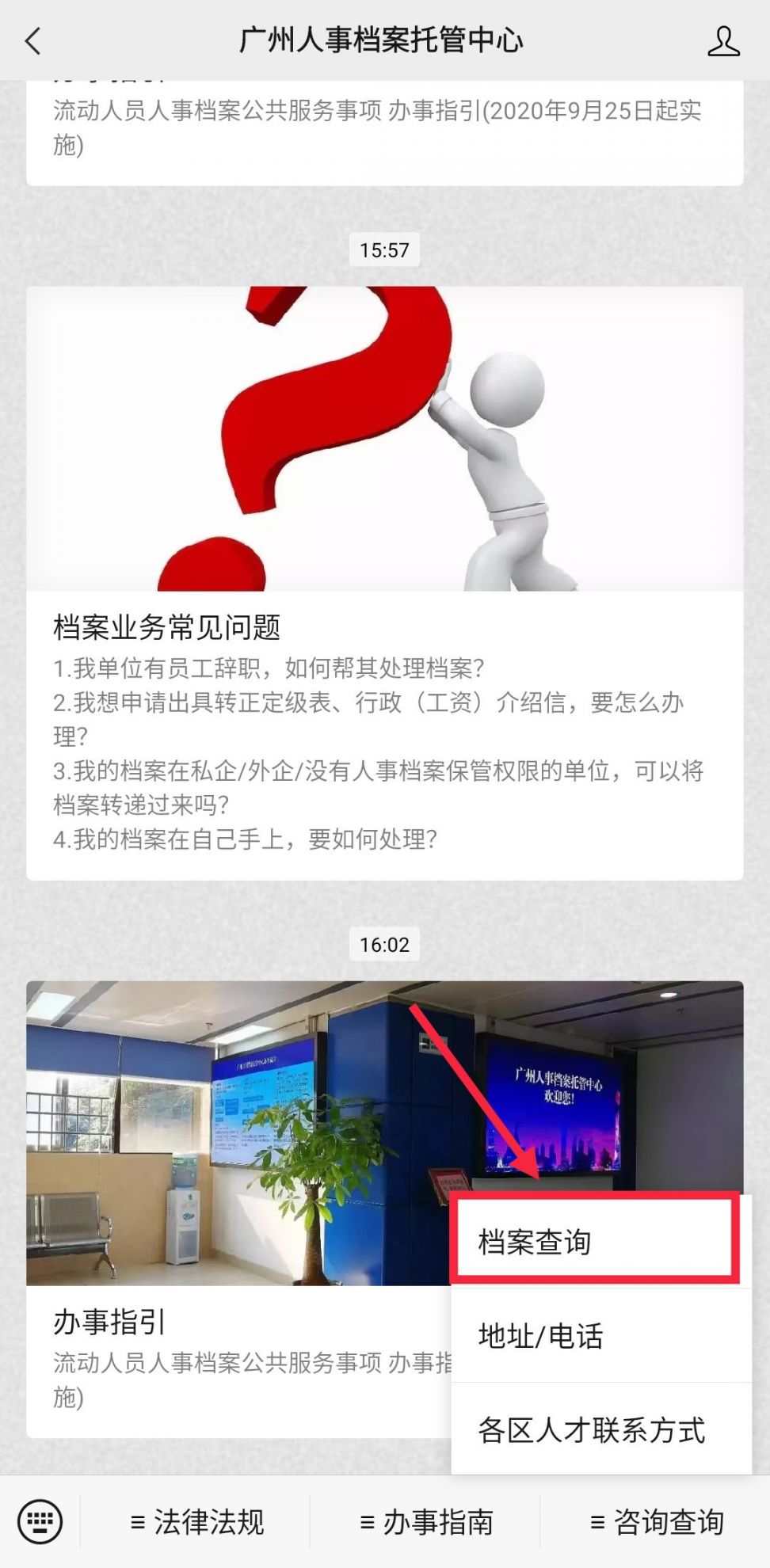 1、进入广州人事档案托管中心官微,在菜单看下点击“档案查询”,如下图所示:
