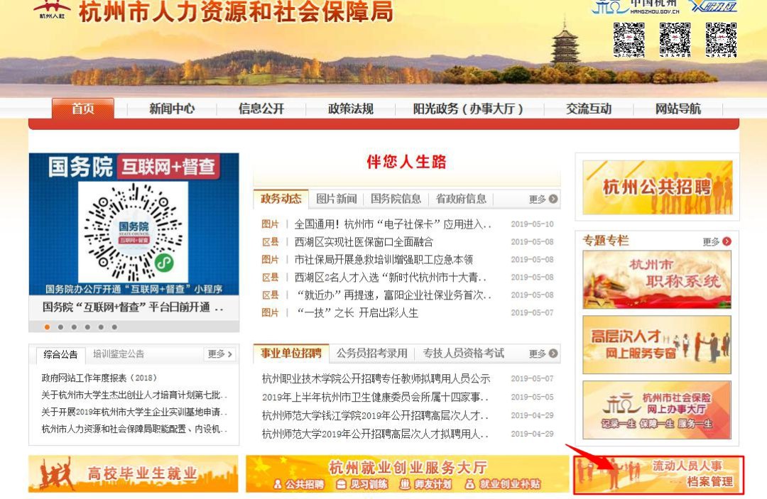 进入杭州市人力资源和社会保障局网,点击“流动人员人事档案管理”进入查询入口