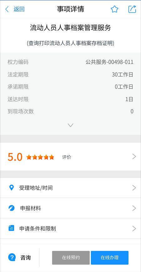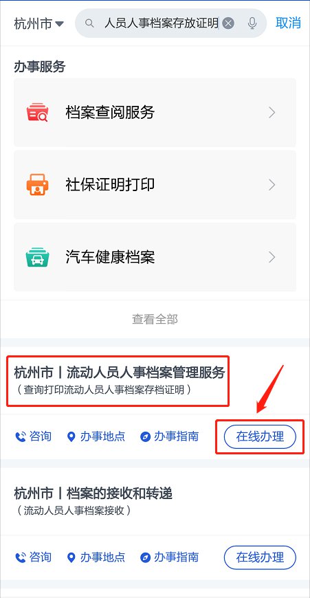 或者登录浙江政务服务网或浙里办APP,选择“杭州市”,搜索“查询打印流动人员人事档案存档证明”事项,点击“在线办理”,实名注册登录即可查询打印。