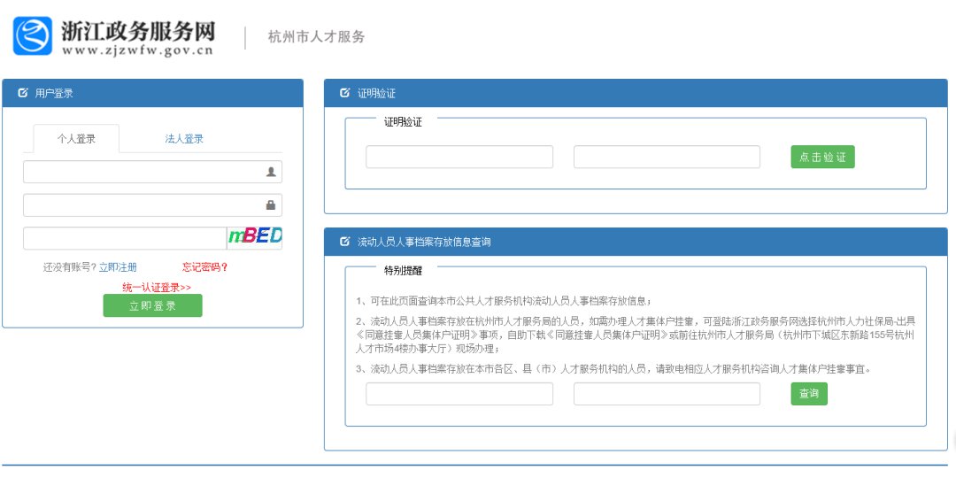 在杭州市人才管理服务中心存档的人员通过杭州市人力资源和社会保障网“流动人员人事档案管理”入口,进入“浙江政务服务网 杭州市人才服务”页面,进行自助查询流动人员人事档案存放信息查询。