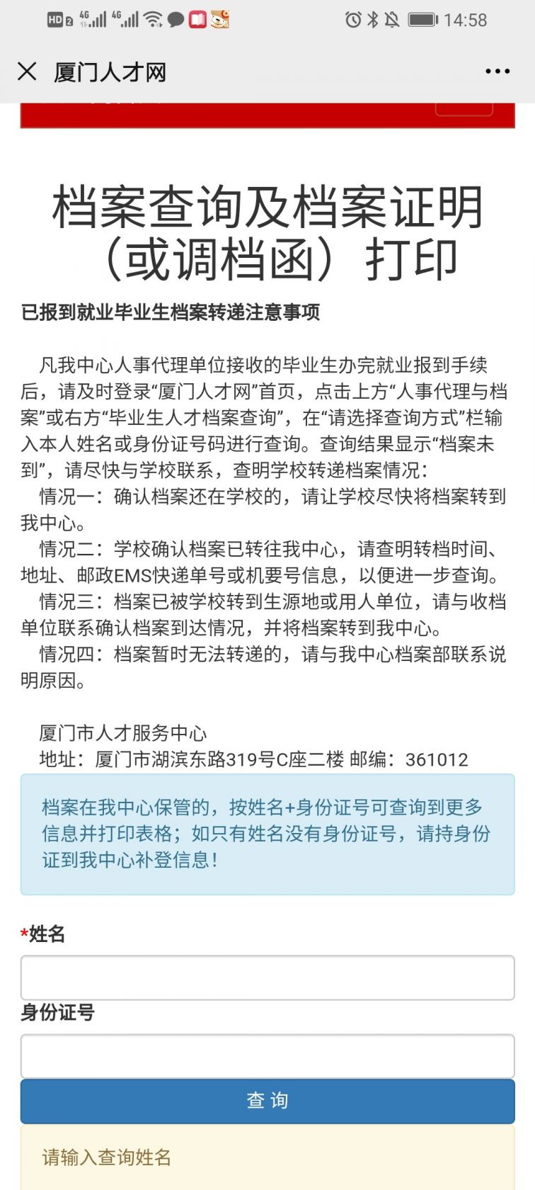 温馨提示:凡是在人才中心人事代理单位接收的毕业生办完就业报到手续后,请及时登录“厦门人才网”首页,点击页面“人事代理与档案”或右方“毕业生人才档案查询”,选择查询方式进行查询,如查询结果为“档案未到”请及时与学校联系