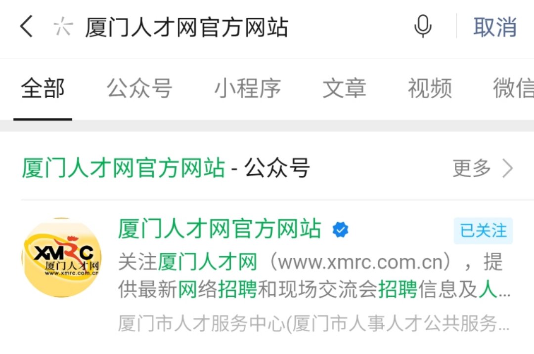 第一步:微信搜索“厦门人才网官方网站”公众号,然后点击进入公众号并关注(如下图所示);
